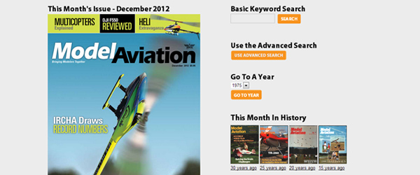 Nearly 450 issues of Model Aviation have been converted digitally into searchable articles and features. That's the equivalent to 85,000 pages, roughly 15,000 articles. Each issue appears just as it did at its original time of publication, often complete with period advertisements. It's a great resource that provides you with access to every "how-to" article, plans build, product review, AMA news, feature, and event coverage relating to aeromodeling. This library is a new, free benefit to all AMA members! Any member can access each issue of Model Aviation digitally at any time. This library was built to be compatible with any computer, tablet, or mobile device. You do not need to download any special software or pay any fees to use the library. If you are not a member, you can join the AMA by visiting www.modelaircraft.org/joinrenew.aspx. We welcome your feedback and suggestions. You can contact us any time by email at madigital@modelaircraft.org. To visit the library, click on the "Library" button in the top right menu of this website (www.ModelAviation.com) or click here. Enjoy your new digital library.